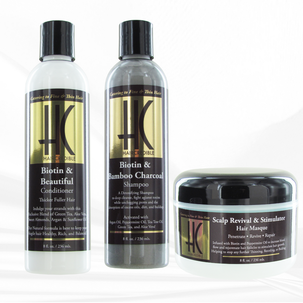 Biotin & Bamboo Charcoal Detox Shampoo – Deeply cleanses buildup and refreshes the scalp while biotin supports healthy growth.